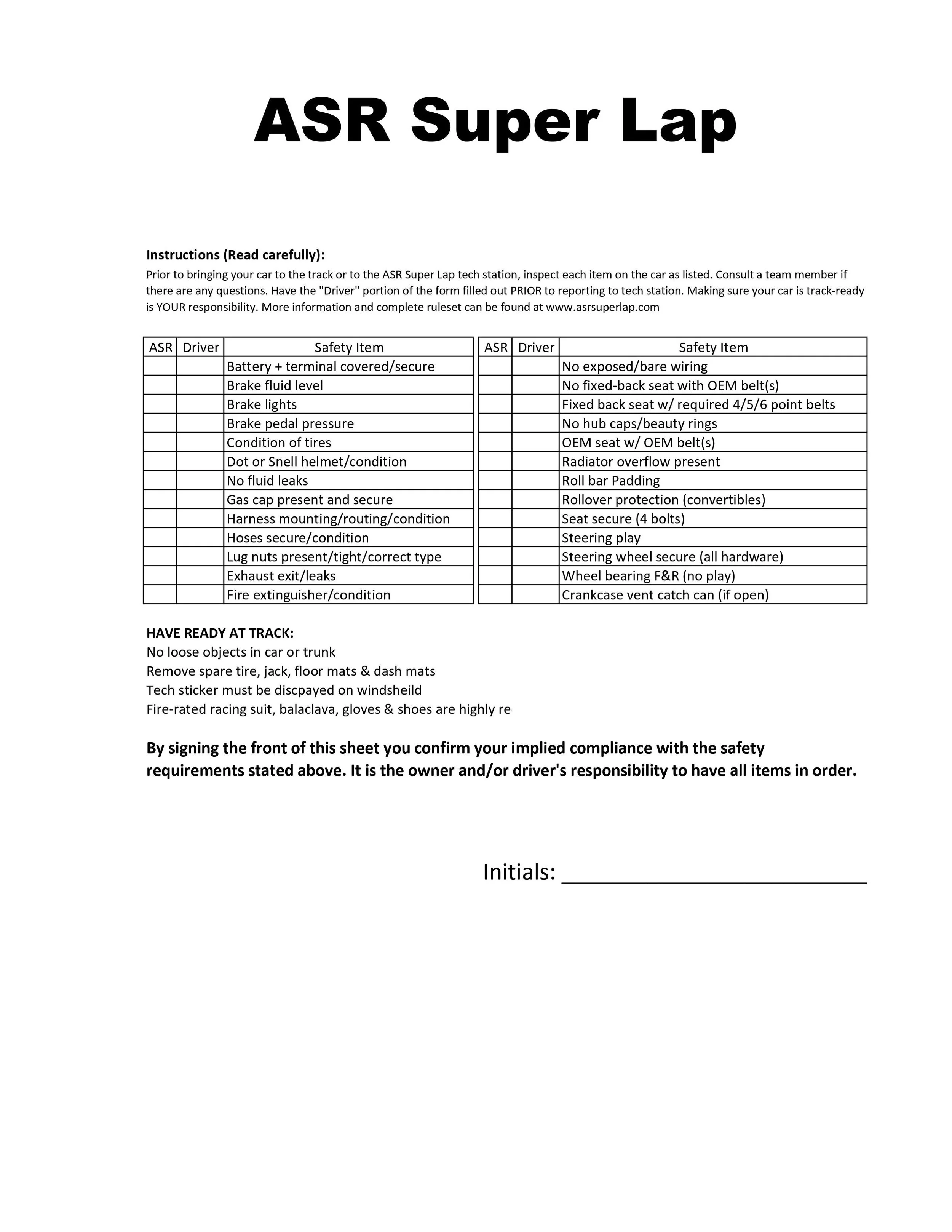 Please have a printed and pre-filled tech sheet with you when you arrive at the track, an ASR Super Lap team member will finalize the tech sheet with you and your vehicle present.